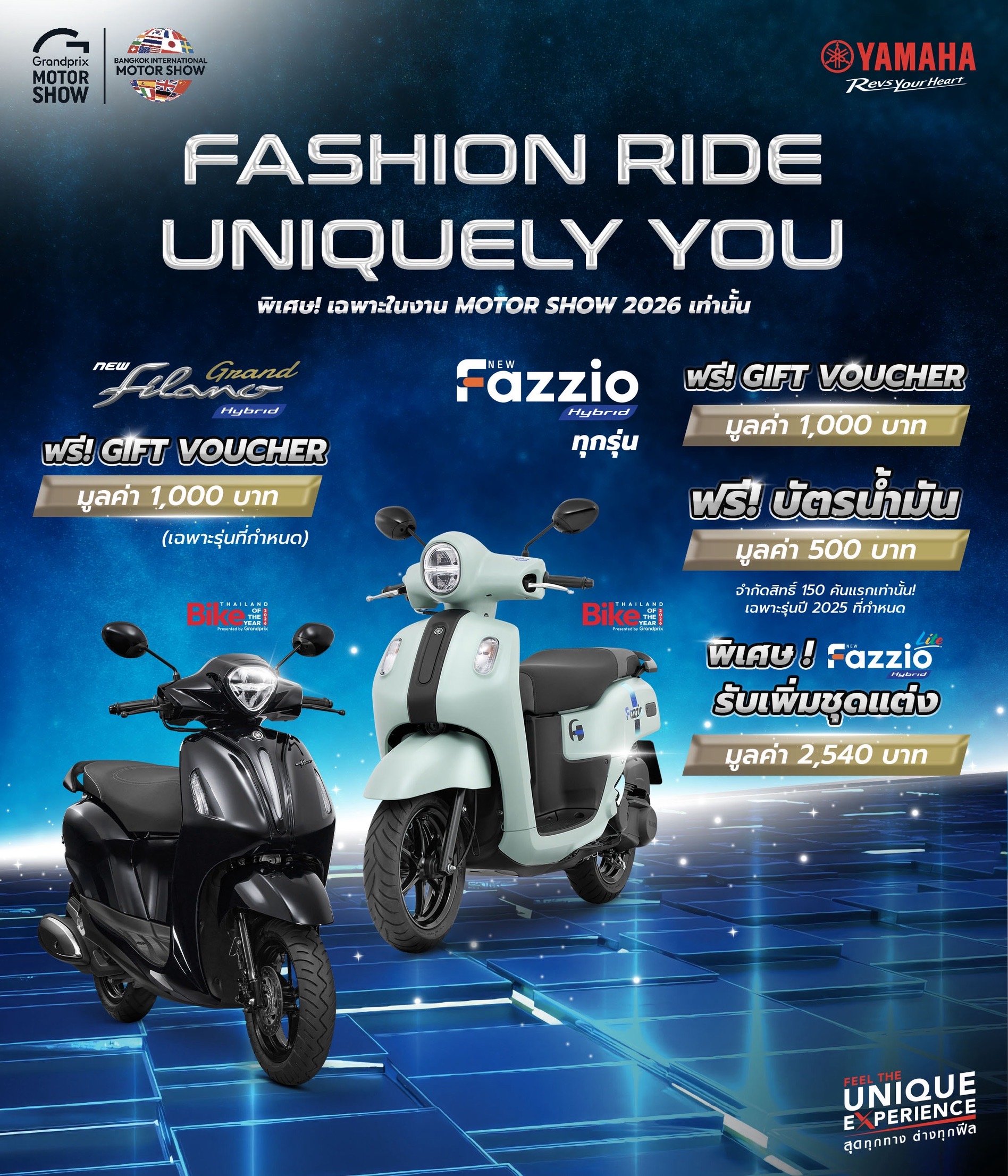 • YAMAHA FAZZIO (สีใหม่ 2026) รับส่วนลด 1,000 บาท + ชุดแต่งมูลค่า 2,540 บาท (จำกัด 200 คันแรก)